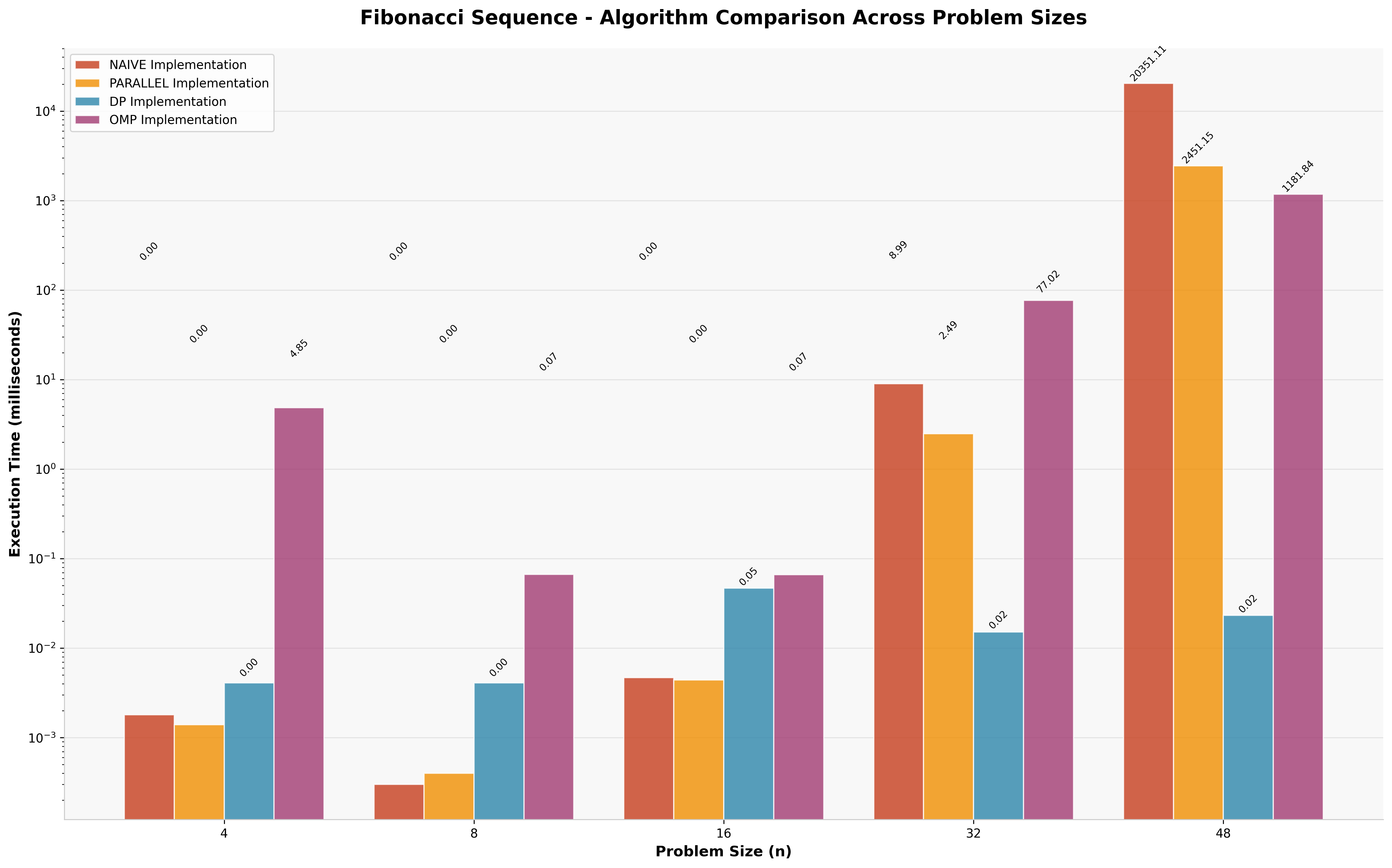 For Fibonacci calculation (n=48), the performance hierarchy clearly demonstrates the impact of algorithmic versus parallel optimization.