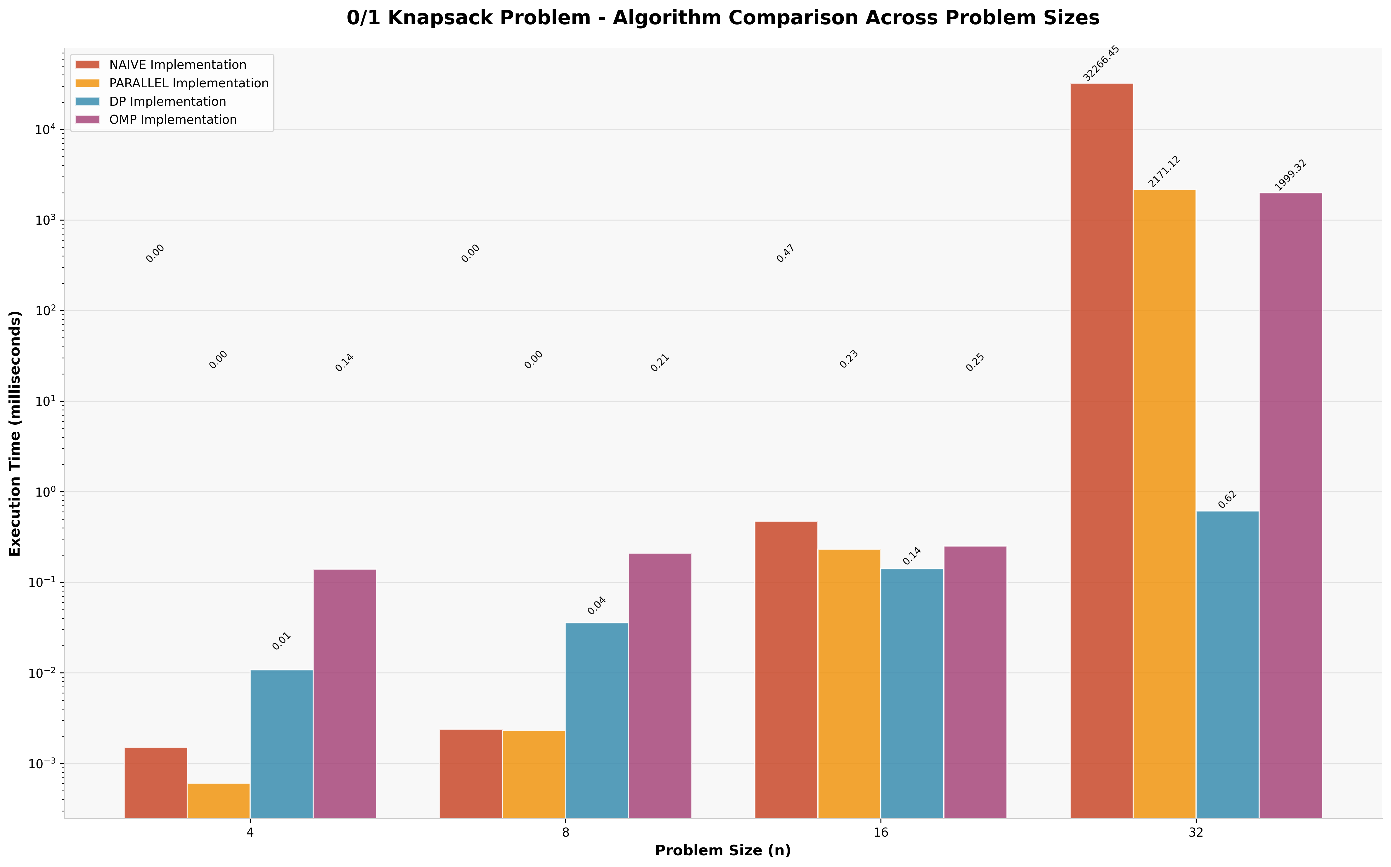 The 0/1 Knapsack problem shows similar patterns, with dynamic programming providing optimal performance for larger problem instances (n=32).