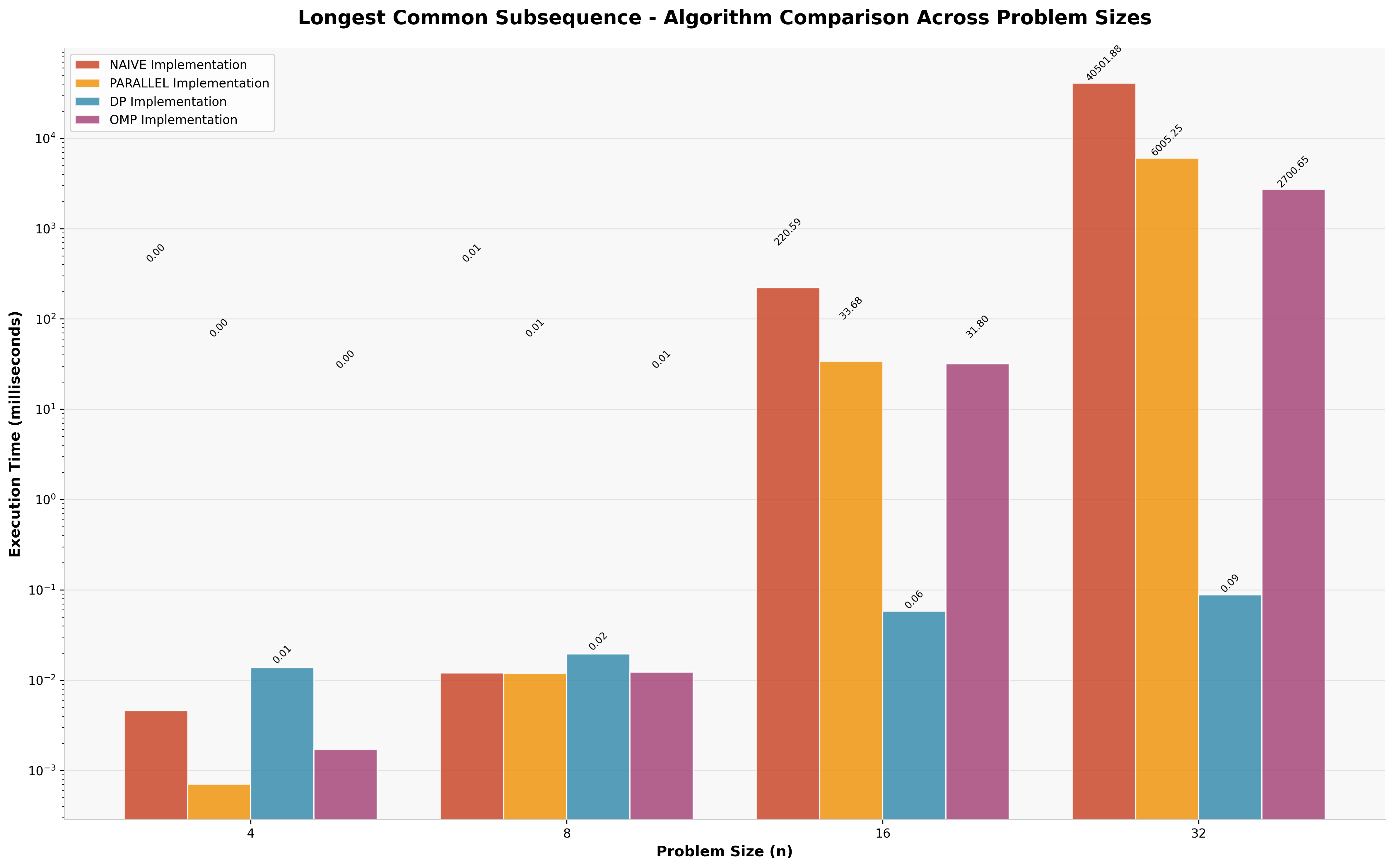LCS results follow the established pattern, with dynamic programming achieving O(m×n) complexity compared to exponential growth in recursive approaches (n=32).